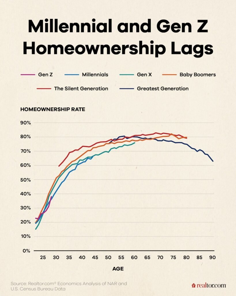 But for the oldest members of Gen Z, near 30, their homeownership rates lag behind most previous generations, albeit slightly higher than millennials’. This delay might be a consequence of waiting for what they perceive as the perfect price.