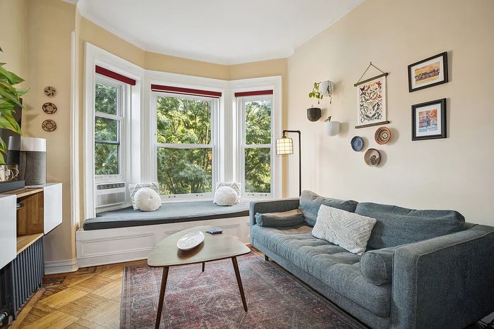 As seen in this listing photo, this one-bedroom in Park Slope has charming bay windows that overlook the Eighth Avenue tree line.
