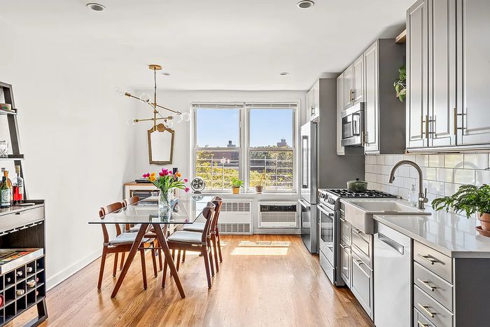 A Windsor Terrace two-bedroom co-op on a high floor in an elevator building and less than a block from Prospect Park — pretty hard to beat. The Bosch appliances and quartz countertops in the kitchen are nice, and there’s plenty of room to breathe between the dining and living areas. The corner-unit primary bedroom, with its double exposures, is well sized, too, and comes with a walk-in closet. The second bedroom is a bit of a squeeze, though — probably best suited for a child. (As for that weird adjacent hallway, which seems like an obvious candidate for a walk-in closet, you could also do a home gym or office). The monthlies are $982 and cover a live-in super, a bike room, and in-building laundry. Along with the park nearby, you’re a roughly 15-minute walk to the retail drag along Prospect Park West and just four minutes from the Fort Hamilton station for the F and G.